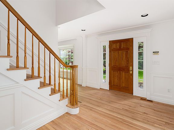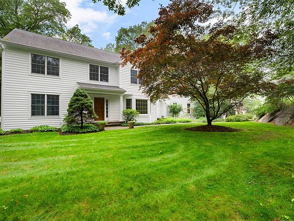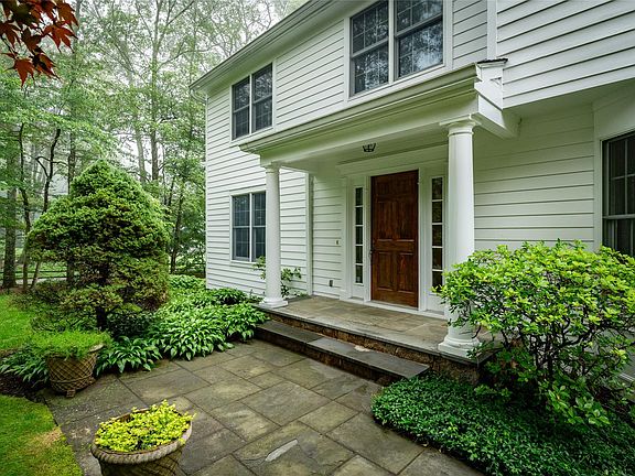 Welcome to this classic 4-bedroom, 4-bathroom Colonial sited at the beginning of a quiet cul-de-sac. With timeless white siding and a two column portico entry, this home offers space, comfort, and elegance in a peaceful setting. Step into a gracious entry hall that leads to a formal dining room and living room. The eat-in kitchen with granite counters and a center island, features top-of-the-line Bosch, Miele & Sub-Zero appliances, pantry and doors to access the deck that opens to the flat, rear yard. Kitchen overlooks and flows seamlessly into a bright and airy family room with a fireplace and four skylights, creating a warm and inviting space. Rounding out the first floor space is a large private office, ideal for today's work from home lifestyle and a first floor laundry room with utility sink and storage. Upstairs, the spacious primary suite boasts refinished hardwood floors, an updated ensuite bath with jacuzzi tub and modern shower, plus dual walk-in closets and an extra closet perfect for shoes and handbags. A cozy built-in cushioned window seat with floor-to-ceiling bookshelves sits just outside the suite, offering a quiet reading nook. Three additional bedrooms, all with brand new carpet, a full hall bath and pull down attic complete the second floor.