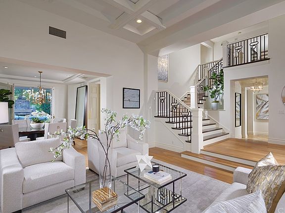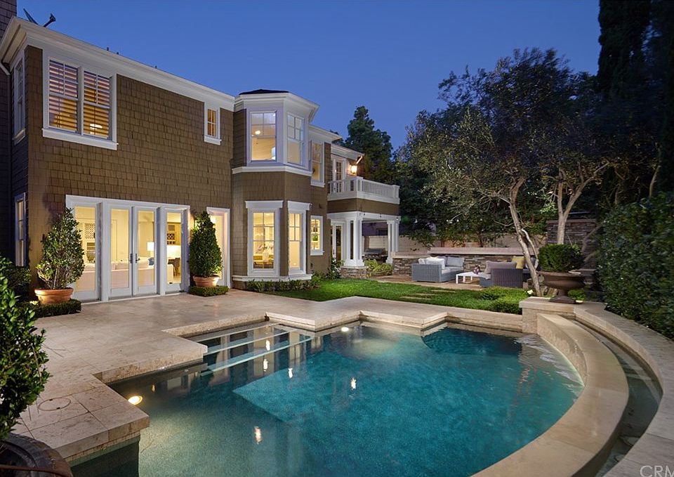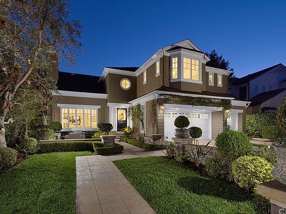A timeless design aesthetic characterizes this extensively upgraded Plan 4 Stonybrook residence situated on a quiet street backing the park in the guard-gated community of One Ford Road. Beyond an expertly landscaped front yard, a Dutch door opens to reveal the formal foyer with two-story soaring ceilings, beautiful white oak hardwood floors, beamed ceilings, and a neutral color palette. Boasting the largest floor plan in the Stonybrook tract, the home encompasses gracious living quarters including an elegant, fireplace-warmed formal living room, first floor bedroom currently used as an office, and a formal dining room with French doors leading to the stone patio. Spanning the width of the home, the patio is host to a built-in BBQ, cooler, bar seating, fireplace, and pebble tec pool with waterfall. Backyard access from the family room with built-in entertainment center and adjacent chef's kitchen with large center island, SubZero refrigerator, Viking double oven, and desk/ office alcove foster an entertaining atmosphere and optimal livability. Upstairs awaits a bonus living space that can be converted into a 5th bedroom, and 3 spacious bedrooms including the master suite with retreat/ office, deck, and master bath featuring large tub, dual vanities, and huge walk-in closet. Completing the residence is a 3-car garage and location close to freeways, beaches, Fashion Island. Community amenities including 2 pools, gym, sports court, putting green, and clubhouse.
