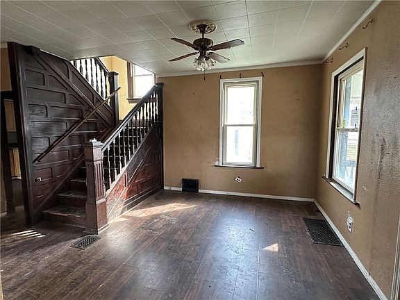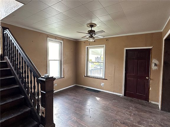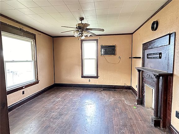 Large four bedroom home on a triple lot with a covered front and rear porch, fenced in yard, oversized 1 car detached garage, carport, and shed.