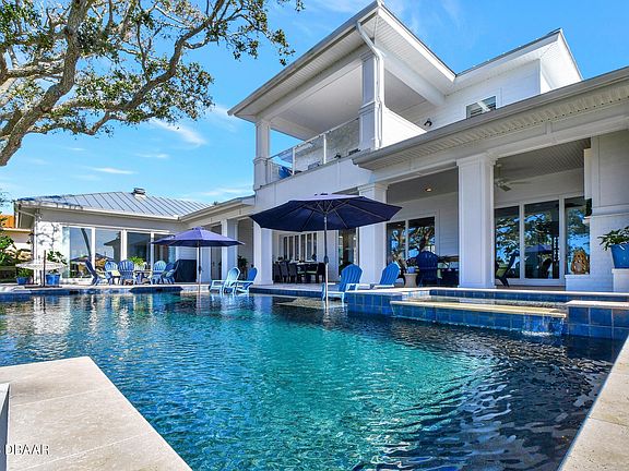 2019 custom built riverfront Coastal home, high on a bluff, overlooking a wide expanse of the Halifax River. Infinity edge pool with spa! Travertine patio. Folding pass-through window from kitchen to outside bar. Fireplace in lanai. 2 balconies. Metal roof, 3 car garage with EV plug. Wood and tile floors throughout. Dual fuel gas range, quartz counters. Multi-gen suite. All bedrooms with ensuite bathrooms. Watch gorgeous sunsets. See dolphins and yachts glide by. Walk to your river beach, or the Atlantic! Your own resort, right at home!