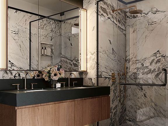 The principal bedroom boasts northwestern exposures, a rare vantage point for sunsets over Downtown Manhattan and harbor views. The four-fixture principal bathroom features walls sheathed in expressive Breccia Capria marble, complemented by Absolute Black granite and white Bianco Dolomite marble flooring in a hexagonal pattern. A custom vanity in a light mahogany finish features an Absolute Black granite countertop, Waterworks fixtures in a custom brass finish, and integrated fluted glass sconces. Additional residence features include Miele washer and dryer and zoned HVAC system for maximum comfort and flexibility.