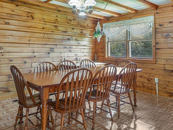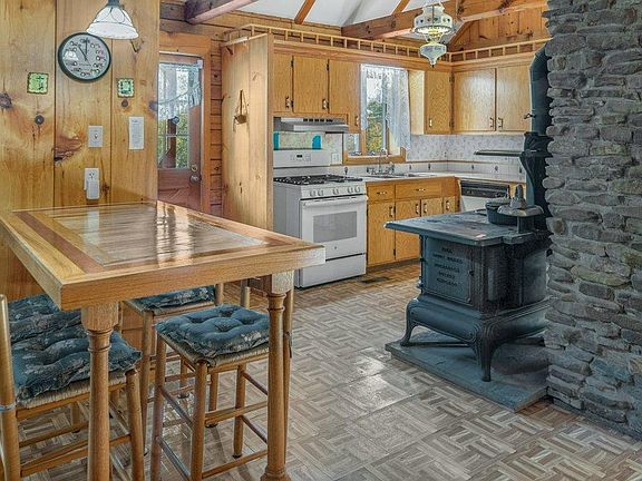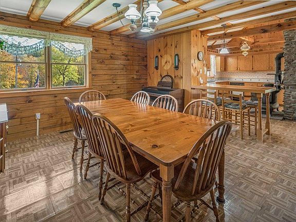 Sounds of nature await you at this log home situated on almost 5 acres. Enjoy the sunrise on your deck while you watch the wildlife around you. This 2 bed/1 bath has endless potential, including additional living space, plumbing for more bathrooms, and unfinished lower walk-out level. Multiple outbuildings provide ample storage. Main floor open living allows for easy transitions between dining and living room. The kitchen boasts a flagstone chimney along with a vintage stove that is used for heating the house and cooking. Upstairs built in storage and window seats provide another spot to reflect on your beautiful surroundings. Turn this unfinished upper level into a primary suite or multiple bedrooms or extra living space, the options are endless! Don't miss this opportunity!