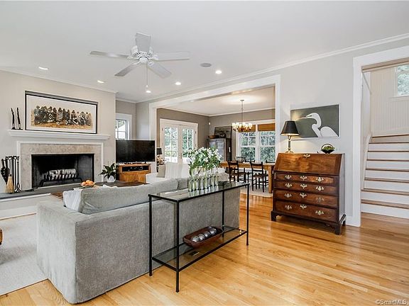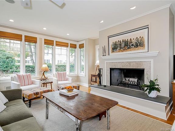 Amazing Rowayton location. Quiet street, halfway between train & village. Craftsman style colonial designed & built in 2003. Light-filled with beautiful gardens, this is a flexible 3-4 bedroom home. Ideal for entertaining. Dutch door entrance to open floor plan. Living room has fireplace & dining room's French doors open to large private deck. Gourmet kitchen has stainless steel appliances, honed bluestone counters, two pantries, & farmhouse sink. Main level has hardwood floors, 10' ceilings, & guest bedroom with full bath. Upstairs 10' hipped ceiling define expansive master suite. Comfortable library area doubles as office. Sunny bedroom has fireplace. Completing suite are largeCalifornia closet, his & hers master bath with spa tub, separate shower & wc. Lower level adds two bedrooms & full bath. Laundry room, one car attached garage & carport. French doors to outdoor terrace. Large driveway for off-street parking.