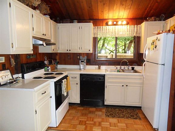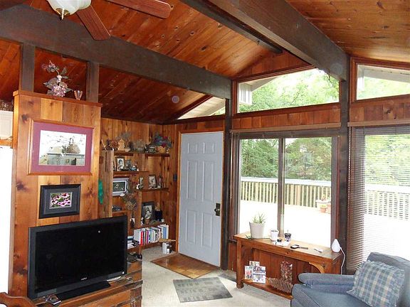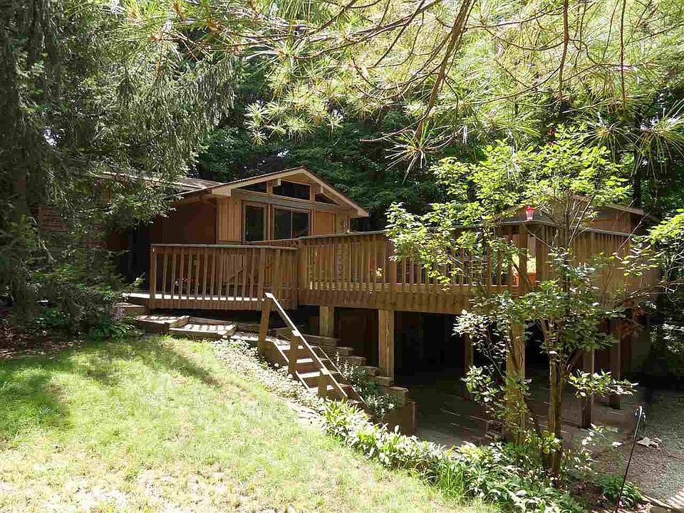 Wooded chalet style home for sale in Woodgate Sub. Nature lovers will love to unwind and relax on the large open deck that sits among the trees. This 2 BR/1BA home has a newer roof and windows. Plenty of natural light throughout this home that offers large windows and an open living area with a vaulted ceiling and wood beams. This home offers an outdoor storage area and covered parking for 3.