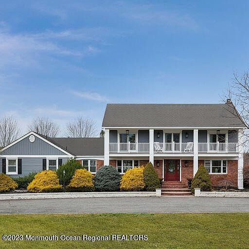This Colts Neck classic center hall colonial sits on 3 acres of sprawling, tree lined, private property on quiet cul de sac. 5 BR home offers open floor plan & spacious kitchen. First floor bedroom/ full bathroom offers separate entrance & living space ideal for mother/daughter living, guests or live in help. Great room w/ cathedral ceilings & sliders flows to grand deck that runs off entire back of home overlooking rolling acres of property. Walk out basement is light filled w/ floor to ceiling windows & sliders to beautiful backyard. Second story mahogany balcony, w/ bedroom access, running off the front of house gives home distinctive exterior classic charm. Newer AC units, newer generator, newer exterior vinyl siding & moldings, LED recessed lighting & newly painted interior.