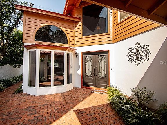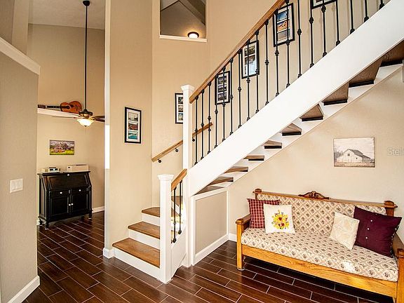BEAUTIFULLY UNIQUE 3 BED 2 BATH HOME IN EAGLES NEST OF WINTER HAVEN ON LAKE CANNON. This home features updates that include all interior paint and new light fixtures as well as tankless hot water heater installed in 2016, AC in 2017, and garage door/opener in 2018. Other unique features of this home include the large wrought iron french doors in the entry that also open to screens for those cooler Florida days. These open up to the foyer with an open ceiling up to the second floor. Downstairs boasts, ceramic wood tiling through out, a large interior laundry room with additional storage in both cabinetry and shelving, a half bath with new vanity as well as a breakfast nook out looking the courtyard and entering into the kitchen. The kitchen has beautiful 42" wooden cabinets, granite counter tops and all stainless steel appliances installed in 2016 (dishwasher was replaced in 2018). There is also eating space in the kitchen as well as dining space that overlooks the living space. The living area holds a wood burning fireplace and also has sliding doors that allow access to the back patio. Upstairs on the second floor, sit all of the bedrooms and the additional two full bathrooms with a split floor plan. One of the secondary bedrooms is oversized perfect for a loft, entertaining or office space. The master bedroom features tinted windows to still allow natural sunlight but keeping away the harsh light. The spacious bedroom also has a generously sized walk-in closet with built in shelving and a large master bath with dual sinks, granite countertops as well as a freshly tiled walk in shower. The secondary bath upstairs also has updates that include new tile on both the floor and in the shower as well as new vanity and lighting. Other unique features include a large brick patio that wraps around the entirety of home allowing for minimal landscaping, and a masonry wall encases the property providing plenty of privacy. The community offers public parking, a community pool and fishing dock open to residents. The HOA fee includes lawn maintenance and pruning of the front yard as well as pool maintenance and maintenance of the common areas. This home is located near major roadways for easy commutes to nearby cities as well as restaurants and shopping.