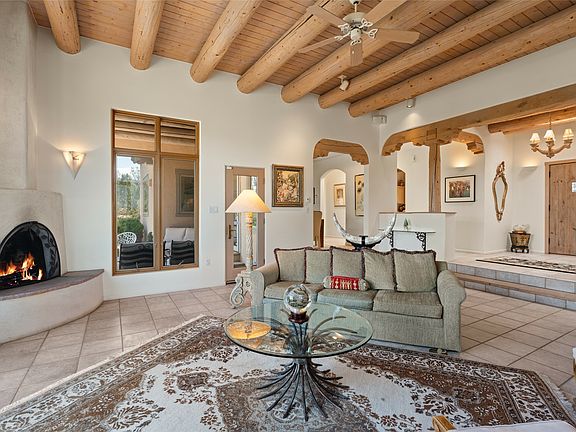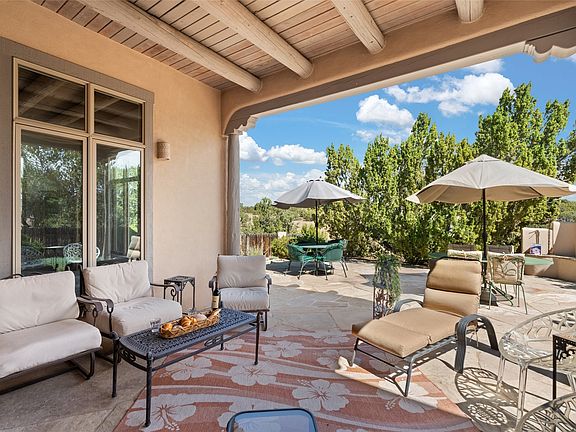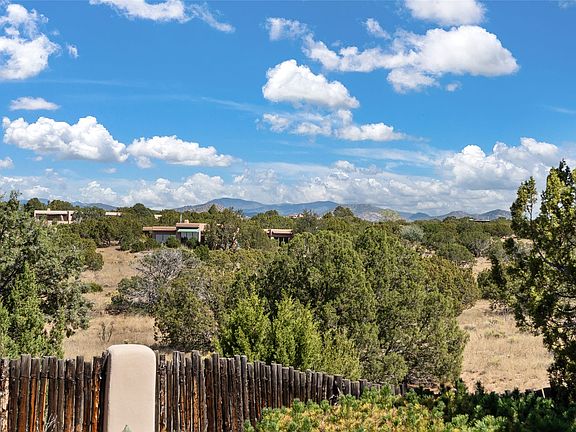 Beautiful Eldorado home, custom-built by Rick Driscoll. This light and bright residence on an acre and half is situated at the end of a cul de sac adjoining a greenbelt with splendid Sangre de Cristo mountain views. Offering three bedrooms and three baths, formal and casual dining, a living room with great views, two kiva fireplaces, and tall ceilings with vigas inside, there are also delightful living spaces outside within a coyote-fenced and lovely landscaped back yard that includes flagstone patios, a third kiva fireplace, a water feature, and a pleasing portal. Wonderful property in a quiet picturesque neighborhood.