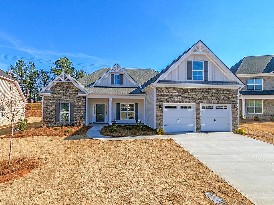 This beautiful Bellamy II plan is main level living with an open floor layout, great for entertaining or family time. The spacious family room has a gas fireplace and is open to the kitchen. Host family and friends for dinner in the stylish dining room. The kitchen features stainless appliances, granite counter tops, pantry storage, and a huge kitchen island. A white farmhouse sink and a clean subway tiled backsplash finish off this functional kitchen. Need more space? There is a flex room on the main level that makes a great office, playroom, or man cave at the front of the home. In addition, a large bonus room upstairs, with closet, would make a fourth bedroom, movie theatre, or hobby space. The split floor plan offers a large master suite for privacy with a large walk-in closet, tiled floor and separate shower and tub. Two additional bedrooms with a shared bath complete the downstairs living space. Additional features include five-inch plank hardwood flooring, crown molding and trim, powder room, grand entry, and covered porch.