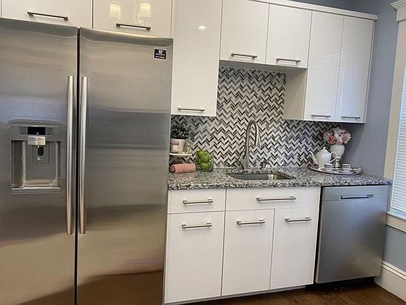 New kitchen ties together modern; glossy, white cabinets with White Mist granite countertops; gray Herringbone mosaic backsplash; brushed nickel hardware; Samsung stainless steel appliances; and recess lighting for an impeccable finish. The completely renovated bath features exquisite Carrara marble walls; Chevron mosaic niches; hexagon marble flooring; luxury rain shower system; soaking tub; sliding frameless tub door with Roller Disk Technology; Delta Nightlight toilet; and high-end navy blue vanity with Carrara marble countertop for a perfect contrast. The bedrooms offer good size closets and plenty of windows allow for abundant, natural light. Early American stain on red oak floors throughout this unit wraps up a stellar living experience. Nest Wi-Fi thermostat, central heating, and Aiphone intercom system offer smart-living amenities. Coin-op laundry in basement.