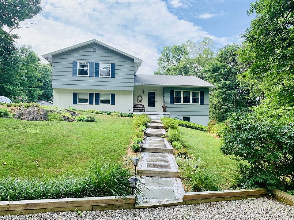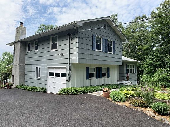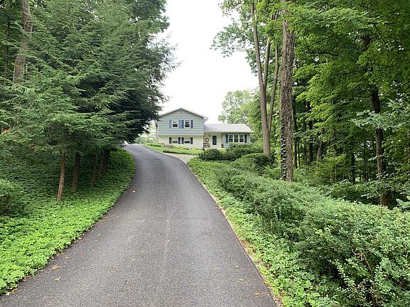 Privacy at its finest! This beautiful 2,868 SF split level has more to offer than meets the eye! Sitting on two bucolic acres this beautiful home offers an open and airy first floor. This includes a large living and dining room room with hardwood floors and an updated kitchen. Skylight and large windows flood the living areas with natural light. The Kitchen walks down to a Family Room with Parquet wood floors, built-ins and a wood burning stove are extended by sliding glass doors to the large back deck. This level also houses an office/workshop, pantry and garage. The second story offers 2 bedroom with a hall bath and a large master suite with a walk in closet. The finished basement has an additional room perfect for a gym or playroom, a spa room including a Sauna, Jacuzzi and shower and a large laundry room with a walkout to the backyard.