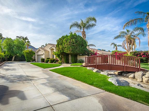 Sometimes the biggest surprises are hiding in plain sight! Desert living on a Grand Scale in this spacious estate-like property. LOCATION: The Estates At Rancho Mirage is a quiet, gated community less than 5 minutes from El Paseo and the River. Just four of these homes were built and are rarely available. This model has 2673 Sq ft on an almost 14,000 Sq ft. lot. Almost hidden from the street your privacy is assured with an extra long driveway, walled courtyards and patios. 3 Bedroom Suites, laundry room, half bath and double garage complement the expansive living spaces. Huge formal entry, Big living and dining area, large den plus roomy eat in kitchen. High ceilings in most of the home only add to the sense of space. Four big sliders lead you to the idyllic patio area. All the best Desert Homes feature outdoor living, but few achieve it on this scale. Here you will not only find views, the pool and spa but an oasis of landscaped, shaded areas, entertaining areas and art. Citrus trees, including pink grapefruit, lemon, orange & tangerine plus a fig tree and herb garden. Large enough for a grand party of 40 people or keep it all to yourself! Misters sunshades, & portable heaters make this an extension of the living space. Thoughtfully upgraded / updated with pull outs in all cabinetry, solar pool heater, attic fan, whole house fan, garage cabinetry, outdoor lighting, 3 zoned sound system wiring and more. Location, Value, Size and Amenities all in one beautiful package