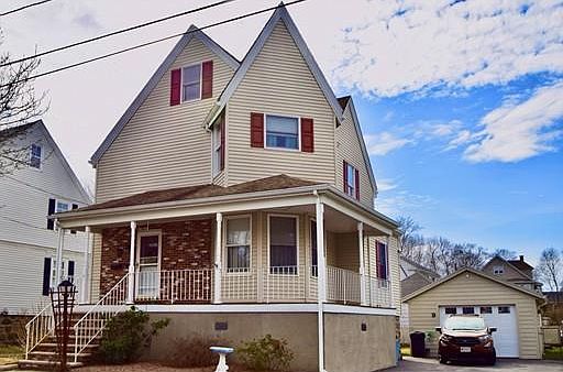 Classic turn-of-the century colonial that has been lovingly maintained and improved for many years by the same family. From the welcoming wrap around front porch to the oversized eat-in kitchen it instantly feels like home. Plenty of room on the first floor with an open concept, spacious living room/dining room and a sunny family room addition with cathedral ceiling and skylight. Upstairs is a full bath and three large bedrooms. Oversized heated garage with work bench and extra storage tucked. Wide driveway for plenty of parking. New composite deck and fenced back yard with sprinkler system. Partially finished basement. Walk up attic for storage or potential expansion. Newer furnace and hot water heater. Anderson windows throughout. Solar panels for energy savings. Terrific location - short walk to playground, elementary school and train to Boston. This is one of those "great bones" houses ready for a new family. Open House Sat & Sunday 12:30-2 PM. Please make appt.