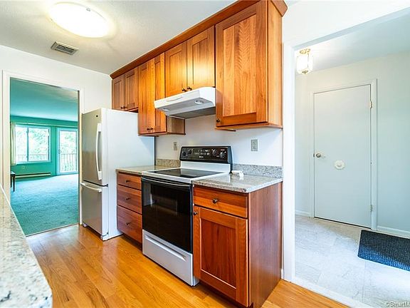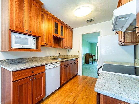 Perched on the Hills of Cromwell, this gem offers more than meets the eye. Delightful, turn key, two bedroom, 1 1/2 bath, open concept living room/dining room, eat-in kitchen, and family room with wood burning fireplace, will truly lift your spirits after a long day. The open concept living dining-room and primary BR each offer a generous, private balcony where you can enjoy panoramic year round southern views and gentle breezes. Enjoy preparing meals in this lovely new kitchen, appointed in Lyptus wood cabinets, India granite countertops, newer appliances, and hardwood floors. All updates boast quality and energy efficiency. Both bedrooms are sizable and offer deep walk in closets. The family room has a thermal paned sliding door, leading to the patio, offers same lovely views, level and lightly wooded back yard, a perfect space for your outdoor social activities. Imagine this finished space as an office, work out space, or an additional bedroom. This home is tucked nicely in the quietest area making it a premium location in the complex, parking is directly in front of your home. Truly a "find" for the discriminating buyer, who is looking for a home that satisfies the soul Special features: marble entryway with California closet system, all new high end, energy star rated, triple pane thermal windows and double pane thermal sliders. Central Air/Heat Pump (heat pump provides both 3-season heat and central air. Easy access to shopping, and major highways and restaurants.