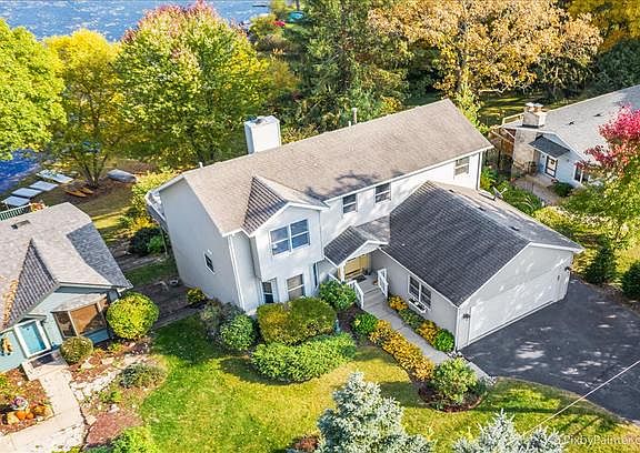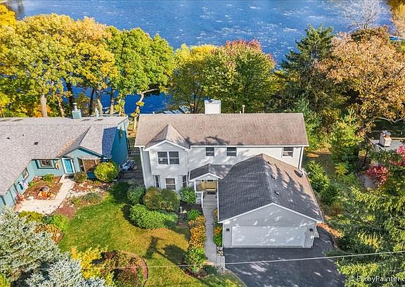Waterfront property in Oakwood Hills! Spacious well maintained colonial home with open floor plan; Hardwood floors throughout; First floor Master bedroom with updated Ensuite; Huge natural stone Fireplace located in Living Room/Great Room with gas starter: Adjoining Dining Room for your entertaining enjoyment; Large Kitchen with updated appliances, countertops and cabinets; Upstairs is second Bedroom with full bath; Adjoining Loft area can be used as Office or additional third Bedroom; Huge outside Deck across the back of house with beautiful views of the landscape; Full unfinished walkout basement that leads to an amazing back yard, Silver Lake and IL State Nature Preserve. A must see!
