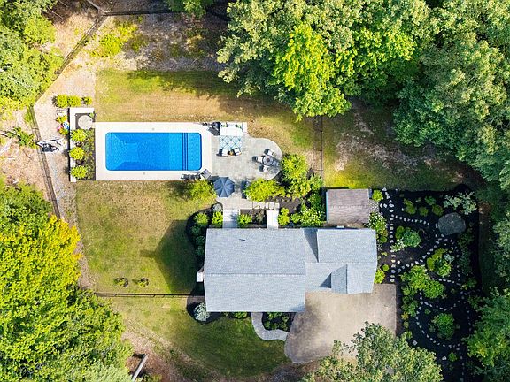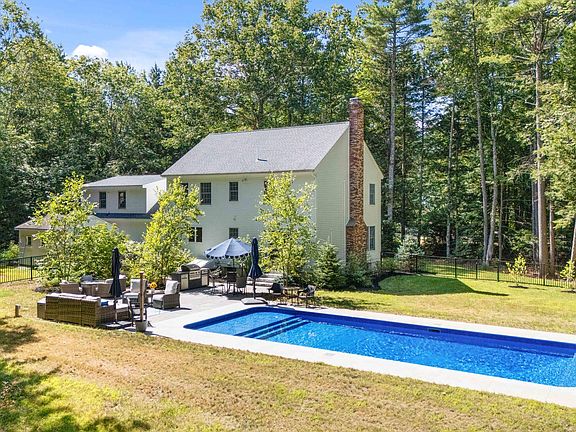 A lush landscape, buzzing with life. A resort-like respite created by renowned designer Ted Carter, complete with a heated saltwater pool. Tucked into the trees on 2.48 acres in Gorham's Bridle Path community, this handsome colonial will have your heart. Inside, rustic radiance prevails, with wood & tile floors, climate-controlling heat pumps, and windows galore. Wildlife watching while dishwashing is a treat thanks to the kitchen's window over the sink. Granite countertops, stainless steel appliances, and an island with seating & storage are a home chef's dream. You'll adore the dining room's nature views. We may not be thinking of snow in the summer, but when the flakes do fly, the living room is ready for cups of cocoa by the fire. A bathroom rounds out the main floor. Upstairs, the primary ensuite bedroom is a relaxing retreat, complete with a beautiful bathroom. Two additional second-floor bedrooms and a bathroom with laundry mean there's space for everyone. Have home office, family room or art studio dreams? The bonus room above the garage delivers. Outside, the expansive patio, in-ground pool, fenced yard, and fragrant flowers will have you hard-pressed to ever leave home. An outbuilding hosts toys & tools, as does the attached 2-car garage. Tennis courts, 21 acres of common land, and a private, peaceful neighborhood are some of the spoils of this special place. Every amenity is within easy reach, be it beaches, shopping, dining, groceries, or gas. Country living with city conveniences is yours for the taking here - come make new memories in this beloved locale!