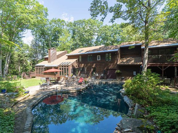 This incredible estate is a private oasis just minutes from downtown Freeport. Situated on over 23 acres with gated access, the grounds include a lighted Har-Tru tennis court, a heated in-ground pool, extensive patio and hardscaping, rock walls, and plantings. The extraordinary home offers over 4,900 square feet of living space featuring both first and second floor master suites with decks, the latter with a stunning walk-in tiled shower in the newly updated bath. Kitchen with butcher block topped island, new quartz counters, and new tile flooring. Living room with cathedral ceiling, wood burning fireplace, and new hardwood floors. Convenient first-floor laundry room with door to the pool area. Windows and skylights throughout bringing the beauty of the outdoors inside. Finished basement with hot tub, shower, and exercise room complete with equipment that will convey. Attached 3-car garage and additional detached 3-car garage. New 5-bedroom septic and new roof in 2015. Very easy 20 minute commute to Portland. Truly an incomparable property.