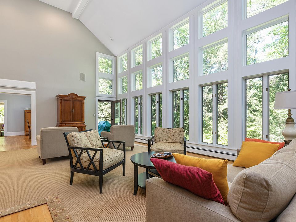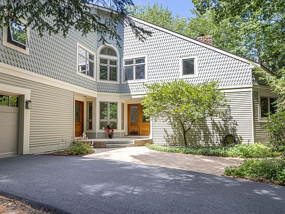 Graceful contemporary in a private setting, Hemlock Lane is an interior cul de sac located in Falmouth's highly desirable Woodlands neighborhood. Sited on arguably the most private lot in the Woodlands, this 5k SF 4 BR home offers recently redesigned baths (4 full and 2 half), new flooring, fresh interior paint throughout, centralA/C and soaring light-filled spaces. Distinguishing features include breathtaking architectural design and elegant woodwork throughout, including a 16 ft tall, standalone river rock Russian double fireplace which graces the Great Rm and the Library. Vaulted ceilings and massive windows look out to the mature, serene landscaping and the 5th fairway beyond. Enjoy beautiful, cozy spaces like a window seat in the library with built-in cabinetry and a 4-season sunroom. The kitchen offers loads of cabinets, ctr island with gas cooktop, dbl ovens, granite counters and stainless appliances. Off the kitchen is a half bath, laundry room, and sunroom. Access the Dining Room via the butler door off the kitchen, then proceed to the central foyer with built in bar, inlaid hardwood floor and a gorgeous central staircase. The 2nd floor landing opens to the GreatRoom and Library below. The 2nd floor large primary suite features a separate room of closets, sitting area, deck overlooking the side yard, and 2 ensuite bathrooms. The primary bath includes a new oversized shower with 5 heads, soaking tub, marble vanity, built-ins, radiant tile floor and cathedral ceilings. An addl half bath ensuite completes this room. Second floor has 2 addl BRs with ensuite full baths, closets and their own character. The daylight walkout lower level includes a family room, 2 bonus rms, storage rm, boiler rm, and full bath. Beyond the 3-car garage are 2 patios, walkways, stonewalls, beautiful hardscape, outdoor lighting, pet fencing system, perennial gardens, flowering and decorative trees, woods and 2 new driveways completed in July. Deeded rights to join the Woodlands Clu