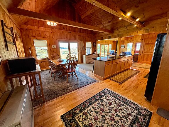 Gentle riseSoaring ceilingsOpen vermont countrysideExpansive wraparound deckOpen-concept layoutNatural woodworkBreakfast bar