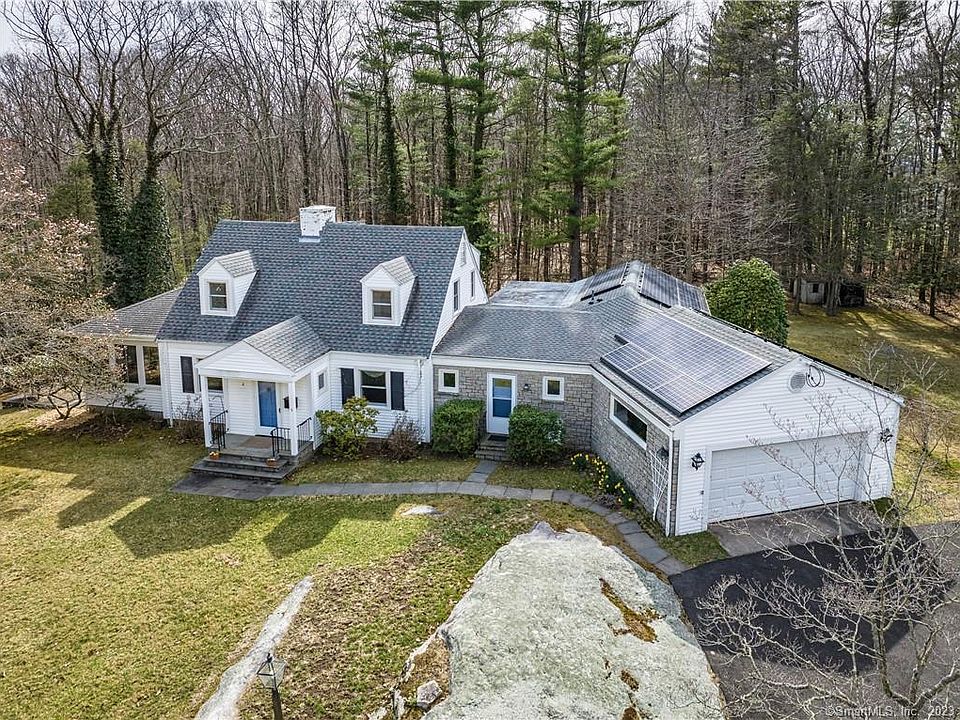 Gorgeous four bedroom, 2.5 bath Cape, many updates: remodeled kitchen, granite counters and new cabinetry, fresh paint and new windows throughout. Rooms are large and bright primary bedroom is 20’ X 18’ glass wall for observing nature across the 25’ X 30’ deck. Laundry is next to copious primary bath which consists of two rooms, one a 15’ X 6’ room with closet, sink and dressing area and the other a 15’ X 8’ separate room with two more sinks, bath/shower and linen closet. There is a heated sunroom sitting area off of the primary bedroom which leads into the kitchen or onto the deck. The great room/living room is 24’ X 25’ and boasts a fireplace, bookcases, and a door out to a patio that is ideal for relaxing and bird/nature watching. In case of inclement weather, nature can be observed from the comfort of the great room through the wall of windows facing the patio. A 15.5’ X 14.5 dining room, a 9.5 X 9.5 den/sitting room/TV room and a half bath and a 14’ X 8’ foyer round out the first floor. The second floor has three more bedrooms and a full and updated bath. The property is served by town water and sewer and is a mere five minute walk to The University of CT campus, The Mansfield Community Center, and shopping are a ten minute walk. Electric bills are defrayed by solar panels on the two car garage. This stunning home needs nothing except the key to unlock one of the nicest properties in town replete with mature plantings and dramatic outcroppings.