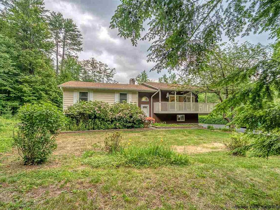 Get away from it all and enjoy this Holly Hills Woodstock move in ready home with Town of Hurley taxes. This house offers lots of natural light with recently refinished gleaming hardwood floors throughout, spacious living room and dining room with 2 bay windows to hang your favorite flowering plants and sliding glass doors from both rooms to a well maintained wrap around deck to enjoy the back and front yards with its already established perennials currently flowering rhododendrons, peonies, azaleas to enhance the peaceful natural setting. Large open kitchen with multiple cabinetry, spacious en-suite master with 2 other bedrooms and another full bath on first level. And there is more, a full finished lower level with spacious family room with fireplace and sliding glass door to private patio, another bedroom and full bath with laundry room. Lots of storage space too! 2 car garage, generator just in case the power goes out and central air conditioning keeping your home cool and dry and a pet door to give your pet easy access to the outdoors. This is country living at its' best, minutes from the town of Woodstock, Hannaford, Bank and Hurley Wine and Spirits. Not too far from Kingston and the NYS Thruway. Yes and the new rail trail is open for a walk or a leisurely bike ride. Or step outside your new home and walk the mile loop around Holly Hills and enjoy the beautiful homes and natural beauty. Very easy to show!