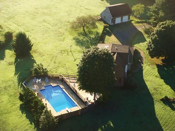 This stately Tudor Colonial house commands a idyllic setting that overlooks its own 5+ beauiful acres, as well as fantastic views of adjacent farmland. Located in a quiet cul-de-sac, the 4-bedroom home features elegant living and dining rooms. The charming family room with wood-burning fireplace opens onto an expansive 2-tiered deck and stunning rectangular pool. Float your cares away as you relax on the pool patio looking at acres of gorgeous countryside. The main bedroom suite is generous with full bath and sitting area. There is an oversized 2-car attached garage, as well as a detached 2-car garage with spacious loft that would be terrific for guests, office, workshop or artist's studio. A wonderful country property for weekend or full-time.