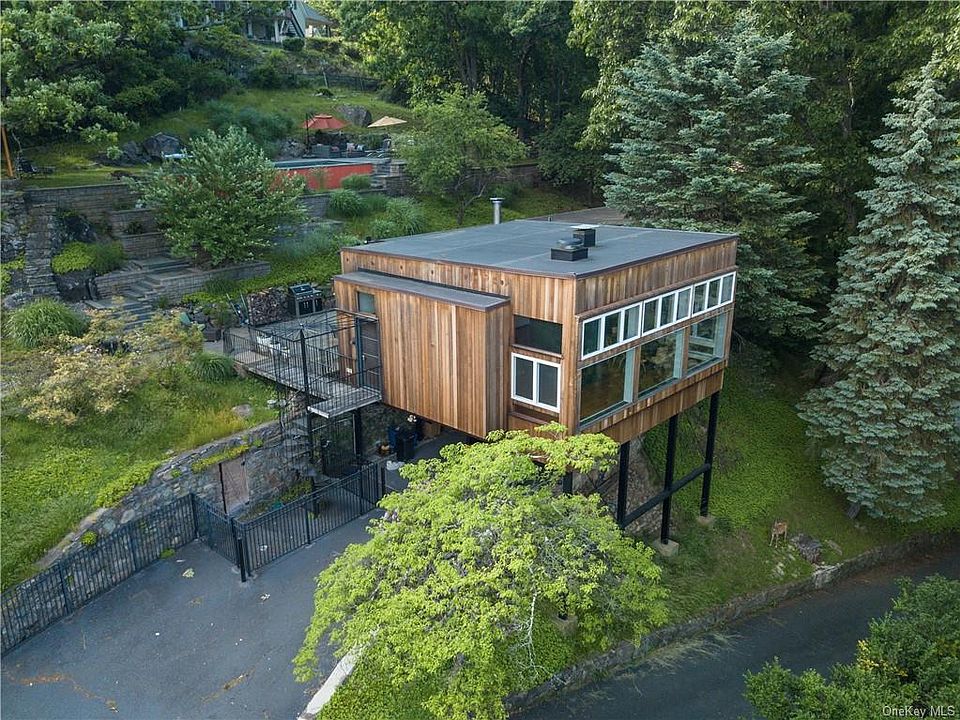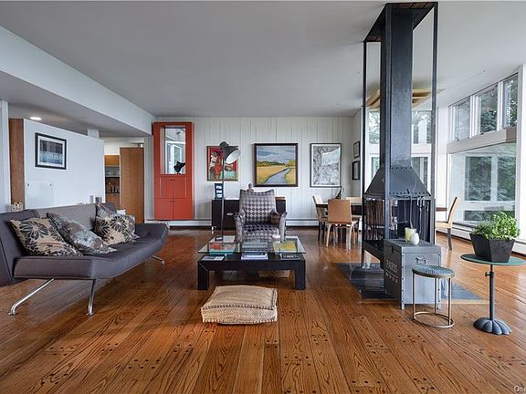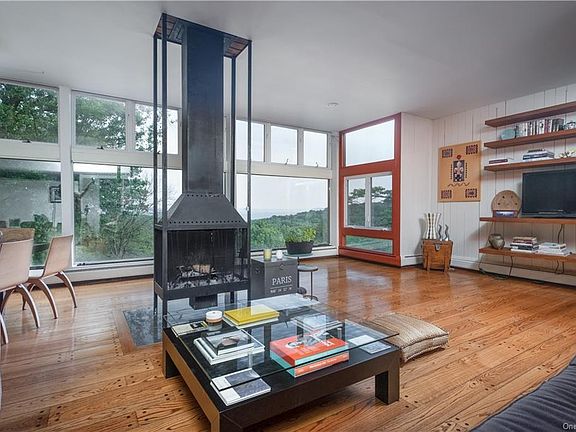 Featured in Real Simple magazine, Moondance is a custom Mid-Century Modern home with breathtaking year-round views overlooking the Hudson River. Located in the Tomkins Lake Colony, giving owners access to the private lake with beach, swimming, boating & clubhouse. This very special home features amazing sunrises and thoughtful custom modern details from top to bottom including a Great Room with floor-to-ceiling windows, a four sided fireplace and wide plank pegged wood floors. Guests can enjoy a Japanese stone soaking tub in their bathroom. There are imported and custom designed Italian Dada kitchen cabinets, loads of storage, hand quarried schist counters, and custom cedar siding selected and crafted by a local artisan. A variety of elegant wood floors throughout, including Australian Gum, pegged oak, vintage wide-board pine, and bamboo. Master BR has multiple closets and a cozy reading/bird watching nook, and radiant floors in the over-sized master bathroom. Enjoy the privacy and solitude of the Hudson s Haverstraw Bay" (the widest part of the River) from the serene salt-water pool, Zen fieldstone pathways and mature gardens. A motorized winch easily hauls shopping, packages, firewood, etc up to the main level from the paved carport. Just 34 miles to the GWB, or commute to NYC via Ferry from Haverstraw to Ossining train station, or from the Garrison station.