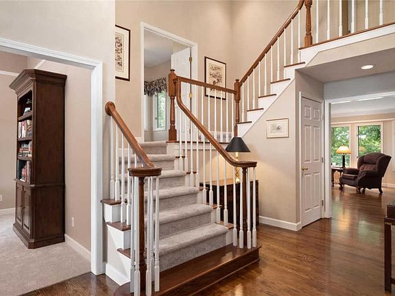 Updated Custom 5 bed, 5 bth, 4300 +sqft home, on a wooded cul de sac lot. Soaring foyer opens to office w/raised ceiling, dining rm, & family rm w/wood flooring, gas fplc & window bay. Kitchen: breakfast bay w/ door to deck, abundant cabinets w/crown & lighting above & below, solid surface counters, tile backsplash, stainless appliances, gas cooktop w/custom vent, double wall oven, island w/raised seating, tile flooring. Laundry & 1/2 bath complete the main. Double door entry leads to a private guest rm [wood flooring] off the first landing. Upper level: master retreat w/dual walkin closets, dual custom sinks, wood surround soaking tub, sep shower, private commode; 2 guest rms, sharing jack n jill bath; junior suite. Finished walkout: family rm, rec area [possible bdrm], kitchenette, & full bath, walks out to covered patio. Enjoy beautiful views from the tiered deck, custom windows throughout, & paver walkways around the home. Addt'l feat: 3 car garage, laundry chute from upper level.