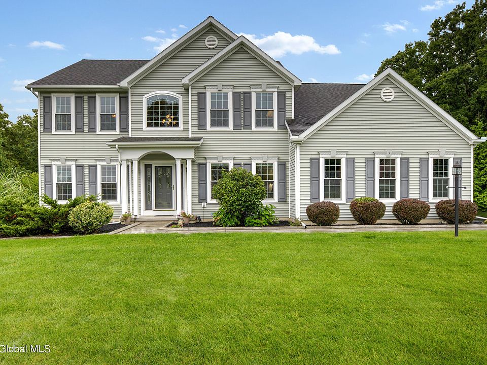 Set on a gorgeous cul-de-sac, here's a meticulously maintained home with a finished basement in the award winning EG schools. This lovely 1-acre property is an entertainer's dream with stunning landscape plantings & stone work, a wood burning stone fireplace & pergola on a private patio, a lower level heated in-ground salt water pool (2023 liner & chlorinator), and then there's a large level side/back yard on the left. Located 5 minutes to 787 & a 1/2 mile off exit 10 of I-90, there's conveniences to everything & offers public water/sewer and natural gas. Perks include custom blinds, unique ceilings, double oven/convection, quartz counters, soapstone sink, gas fireplace, primary with an oversized WIC with a built-in safe, a jetted tub, dual sinks, 50-gal H2O & an inground bball hoop.