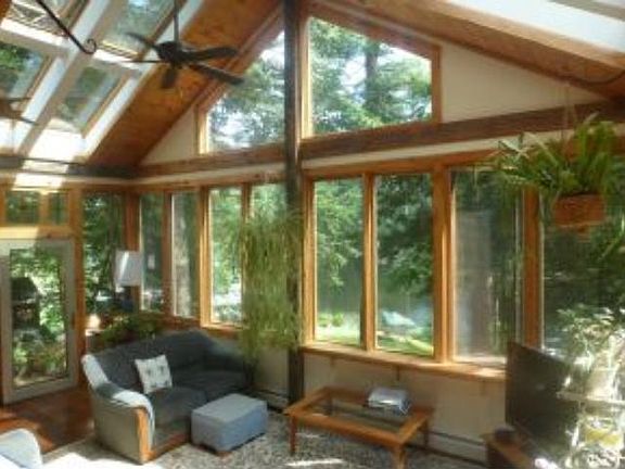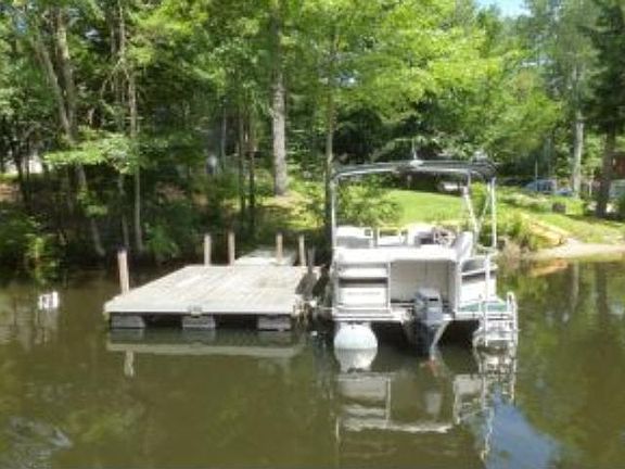 Year Round Post & Beam home with 163 feet Waterfront on Pawtuckaway Lake. Beautiful sunroom living area fronts a large GREAT room, complete with dining area, kitchen with maple cabinets, entry hall, and piano nook. All night wood burning stove adds cozy warmth for winter. Master bedroom has full bath, large walk-in closet, private balcony with spiral stairs descending to brick patio. Entertaining is a pleasure . three bedrooms with plans to convert the downstairs to a master with bath. Sunny yard and South facing sandy beach and dock . Perennial gardens abound along the brick walk. Heated 2 car attached garage. walk out basement workshop set up with dust removal system for woodworking enthusiasts and hobbyists. 300 ft to trails in 5000 acre Pawtuckaway State Park!