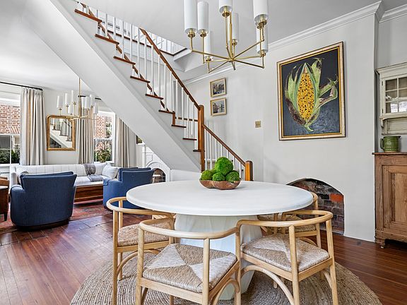 Step inside to discover the inviting first floor, adorned with high ceilings and abundant windows that flood the space with natural light. The living room beckons with plush seating, a decorative fireplace, and a Smart TV, providing the perfect setting for relaxation. Adjacent, the dining area sets the scene for intimate gatherings, showcasing a spacious table with seating for six. The adjacent kitchen is thoughtfully designed with stainless steel appliances and all the essentials for culinary endeavors.