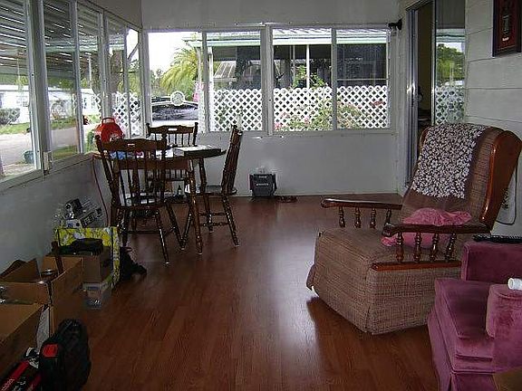 This 2 bedroom comes partially furnished and is located in Eastern Shores. Very well maintained and has laminate flooring throughout the living area and the bedrooms. The dining area has a built-in hutch. Large Florida room on the front of the home. Covered carport with storage shed plus an extra shed. Affordable lot rent and it covers water, sewer and trash. JUST REDUCED! Over 700 homes available at http://www.fourstarhomes.com