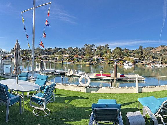 Serene waterfront setting with a 60/ft dock, spacious, (artificial) grass patio spans the full width of the lot and overlooks the water. Mid-century modern, custom-designed home with floor to ceiling glass facing the water. Home is all on one level, has two-zone forced-air heating, very large driveway, which can accommodate 10 cars, leading to double garage. Extensive landscaping front and rear which includes lemon, pear and apricot trees and several mature palms. Open design kitchen completely remodeled in 2017. All electrical upgraded in 2017. One block away from Pickleweed Park where there are walking paths along the waterfront for at least 1 1/2 miles.