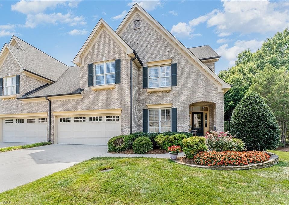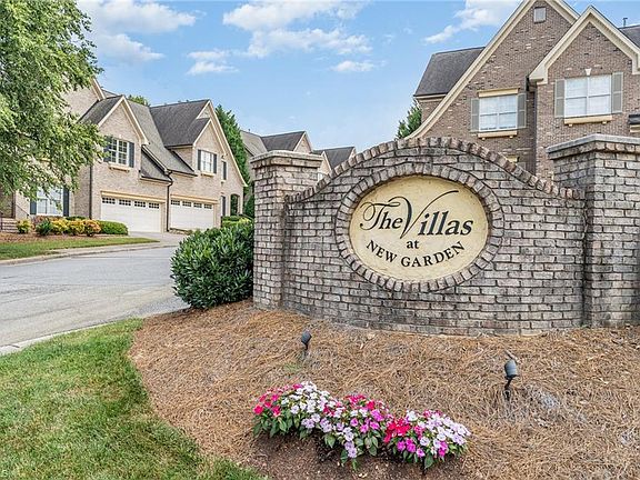 Spacious brick townhome with custom upgrades and 2-car garage presents an excellent opportunity to downsize in style. Primary suite on main with tray ceiling, walk-in closet and large dual-vanity bath with walk-in shower and separate jetted tub. Living room with 2-story vaulted ceiling features gas-log fireplace flanked by built-ins. Living opens fully to dining area and kitchen with eat-up island, stainless appliances, and pantry. Front room with French doors on main serves as office, larger dining or sitting room. This property delivers all the extras with its high ceilings, natural light, plantation shutters, hardwoods on main, tile baths, granite kitchen counters and wood moldings. Laundry on main. Wrap-around deck with gas grill. Bonus Room (Bed 4) has en suite bath. Walk-in attic storage. The Villas at New Garden is a 20-property community nestled between Brassfield and New Garden retail centers. Easy access to Bryan Blvd, Battleground/220N, parks and Greenway. See Agent Remarks.
