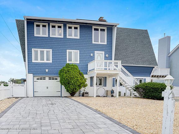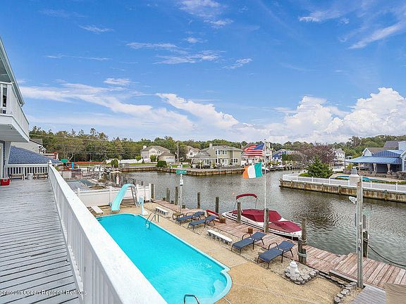 Waterfront chalet in desirable lagoon community in Brick! This 1 of a kind home is set on an oversize lot w 75 linear ft of water frontage. Featuring a 32x17 in-ground pool, significant patio/deck sf., this is the perfect setup for entertaining! Charm abounds throughout w dramatic exposed beam & vaulted ceilings, canadian cedar walls, built-ins and a breathtaking family rm w fireplace as the centerpiece of this unique home. 4BR and 3 ba inc master w en suite full bath. Lower level is direct entry garage, BR, bath, large living room w/ frplc, 2nd level is fam rm, open kitchen/dining, BR & bath, 3rd level is master, another large BR, office/5thBR and also rough plumbed for potential bath. Stunning water views throughout & multiple access points to the yard/deck areas. Flood ins under 900!