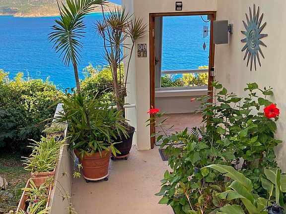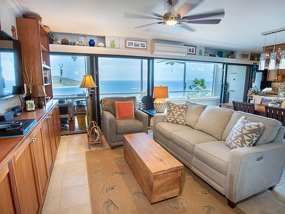A step above, this one bedroom Mahogany Run condo has a multitude of special features to recommend it. The owners have expended every effort to take what is a very livable design and elevate it with special features and additional storage. There is custom mahogany cabinetry throughout, high end kitchen appliances and quartzite counters, a contemporary clean lined bathroom with double sink vanity, linen closet and walk in shower enclosure and unique to this unit is the addition of a powder room making this the only 1 bedrm 1 1/2 bath unit in the complex. The master bedroom has been expanded with a built in desk with a view guaranteed to distract you as you work. Above all is the beautiful view from Hans Lollick to the BVI visible from all of the rooms and to be enjoyed from the 32' deck
