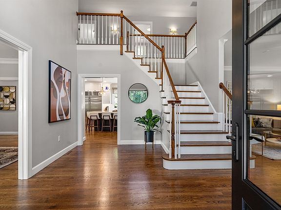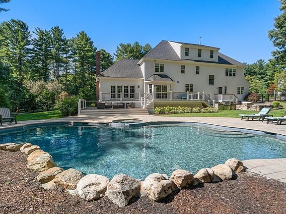 Magnificent and masterfully updated 4-level home located in the exclusive MacIntyre Crossing neighborhood. Situated on ~1 acre surrounded by conservation land, this residence has been renovated inside and out with exceptional attention to detail. Enjoy the new chef’s kitchen with Miele appliances, coffee bar, custom cabinets, quartz counters, and large island. Walk outside to your personal oasis with newer salt water gunite pool and spa, outdoor kitchen and bar, and two-level deck - or simply relax in the expansive entertaining room. The dining room is perfect for large gatherings, and the sitting room welcomes you with a Victorian-style turret. The second floor boasts a large primary suite with custom closets & en-suite bath; 3 additional large bedrooms with a renovated bath; and a laundry room. The third floor has a large media room perfect for movie nights. Finished lower level w/gym, full bath, & stairs to exterior. Well-based irrigation system and newer heating, AC, and roof.
