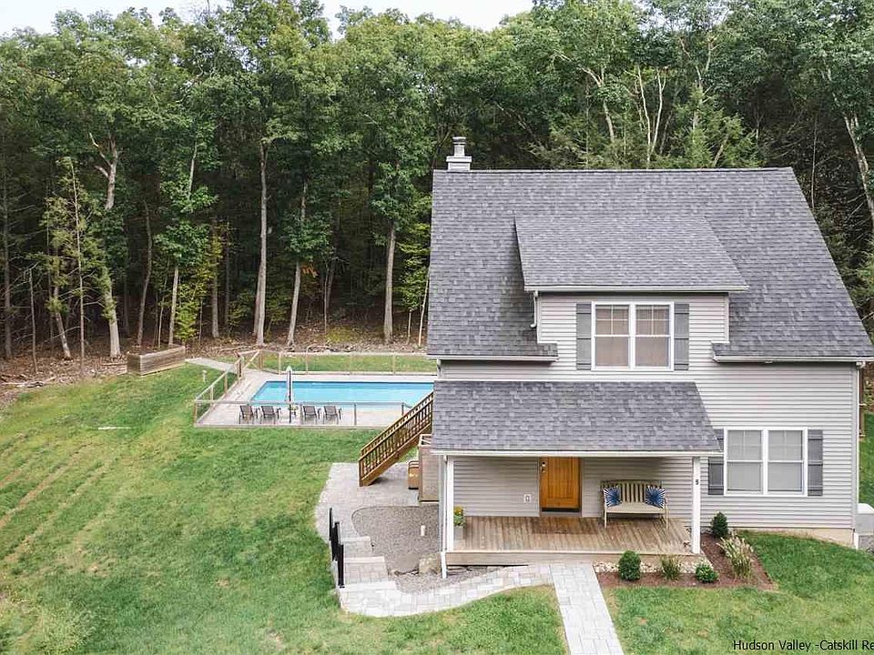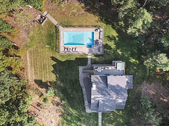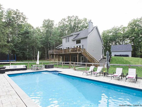 Looking for an ideal location, private yet close to the center of Woodstock and Kingston? Have you wanted a house that is virtually maintenance free and built in the past 6 years? Were you wanting a swimming pool, but were told it would take 2 years? Then look no further! Magnolia Trail is a small enclave of custom built homes 10 minutes to the center of Woodstock and 15 minutes to Kingston. The house features a covered front porch and entry way with stunningly contemporary designed wood staircase. The open living room, kitchen and dining room is perfect for entertaining and relaxing in front of the wood burning fireplace. The kitchen is equipped with Wolf range, Subzero refrigerator, Miele dishwasher with hand picked quartz countertops and bar designed with wine fridge and ample storage. There is a screened in porch off the kitchen and full glass doors opening onto the deck made with Trex decking. An 8 seater hot tub sits on the deck over looking a heated, saline swimming pool. There's one full bathroom and bedroom on the main level. Upstairs is a primary bedroom with walk in closet, a full bathroom with jetted bath tub and quartz counters. A second bedroom is located on the top floor next to the main bedroom. The lower level is a huge open space with another full bathroom, bedroom and laundry room. There is access to a lower patio and path to the swimming pool from the lower level. Outdoor shower is just off the side of the house near the pool. The house includes a full house back up generator as well as top of the line, high efficiency furnace for heat and hot water. In addition there is central ac and radiant heated floors. The owners added the 2 car garage as well as the swimming pool. Square footage includes 1024 square foot lower level.