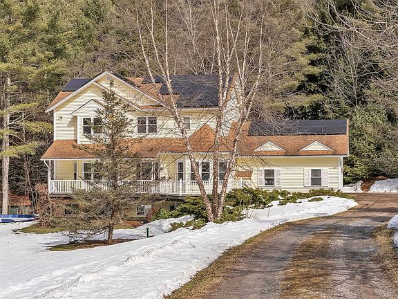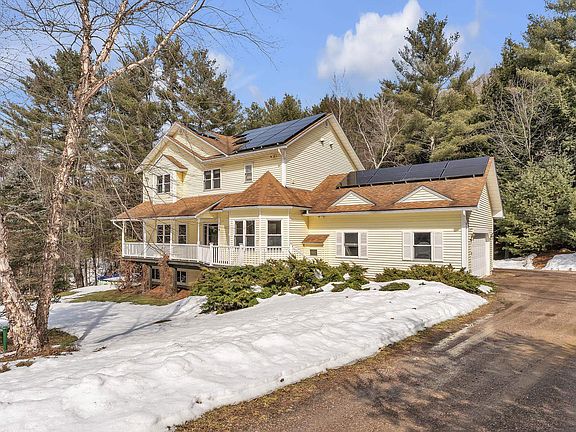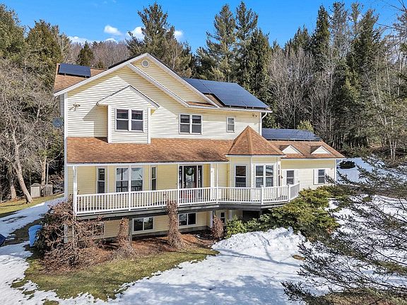 Situated on 4.76 private acres, this turn-key property offers a peaceful retreat with wooded surroundings, designed to bring nature inside and to maximize energy efficiency. The home boasts a 5-star efficiency rating (2002) with additional attic insulation added over time, ensuring comfort year-round. Owned solar panels are mounted due south, and are equipped with individual microinverters to allow each panel to operate separately to maximize solar gain when some shading occurs. The covered front porch is the perfect place to relax and shields the house from too much solar gain in the summer, keeping the home cool. The large open living room and dining room invite you to settle right in, with newly refinished hardwood floors and a gas fireplace. The spacious kitchen features granite countertops and cherry cabinetry. There is radiant heating throughout the house. Outside, enjoy the custom fire pit surrounded by swinging benches, with a view of the waterfall—a perfect spot to watch fireflies dance on warm evenings. Flowers were planted to bloom throughout the growing season, while the woods provide privacy and breathtaking autumn foliage. With thoughtful details throughout and a layout designed for relaxation, this home is a true sanctuary. It’s a place where you can live in harmony with nature and truly never want to leave.