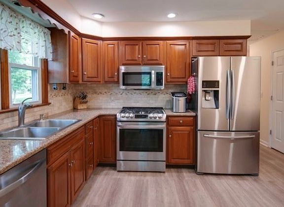 Well maintained 3 bedroom ranch with upgraded bathrooms, kitchen, interior doors and front door. Hardwood floors, Large bow window in living room looking out to open level lot, and wood burning fireplace, all with one-level living. Basement walkout to back yard. Trex deck off the kitchen. Large oversized garage. Close to restaurants, shopping. You will love coming home!
