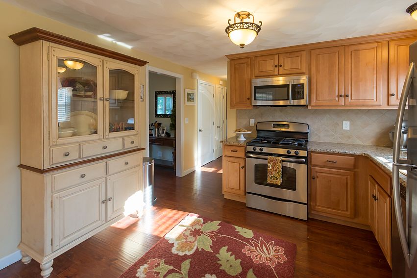 Beautifully updated inside and out in 2012. Almost 1,700 sf of living in desirable Atkinson. Neutral tones & a Pottery Barn feel best describe this warm & inviting home. Eat in kitchen w/ granite tops, ss appliances & custom cabinetry opens to living room w/ wood-burning fireplace. Dining room offers custom woodwork, including chair rail, crown molding & built ins. Additional bedroom /office space on first floor w/ full bath. Second level w/ tiled half bath and granite tops. Two front-to-back bedrooms with his & hers closets, built-in cabinets & bonus walk-in closet in the master. Additional space in bright sunroom overlooking private wooded backyard & spacious covered patio area. Updates include new kitchen, baths, interior walls, insulation, flooring, heating system w/ forced hot air/central air & vinyl replacement windows. New septic system in 2012, along w/ vinyl siding, roof, driveway, back porch, sec sys & town water! Great commuter access near 495 & 93. OPEN HOUSE 3/22 11-1 pm