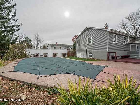 Situated on a premium lot in one of Latham's most desirable neighborhoods sits this Wedgewood model split featuring over 2310 sq ft of living space. 2nd floor features HW flrs t/out including formal LR & DR as well as an eat in kitchen leading to 3 BEDROOMS and a full bath. Lower level has cozy family room with tiled flooring, a masonry wood burning fire place as well as a 4th BR w/ access to half bath that could easily be converted into full bath. Freshly painted throughout. Unfinished living space available in basement area with garden level windows. Awesome yard with IG pool overlooking forever wild. Award winning North Colonie schools and within walking distance to Latham Ridge elementary. Low taxes and well maintained.