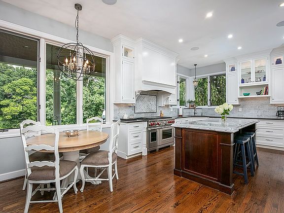 Elegant custom built colonial sits graciously on 3.35 acres on a quiet, dead-end street. Enjoy un-paralleled views and privacy with wooded land across the street and sweeping hillside with babbling brook in the backyard. All of this can be best enjoyed on two large brick covered porches with gracious columns. Beautiful landscaping with curved stone borders create an inviting entrance. Step inside to a bright two-story foyer with large chandelier on mechanical lift. The fully remodeled kitchen is a chefs' dream! It features custom white inlay cabinets with glass uppers, large white basin sink, marble subway cabinet backsplash, dark quartz countertops on the perimeter, white and grey quartzite in a stunning double waterfall cut on the dark wood island with seating. A 48" WOLF dual tech gas range and a built-in Sub-Zero fridge finish off the spacing. LED lighting is featured in the upper cabinets, under cabinets, recessed cans as well as chandeliers. The wet bar adjacent to the kitchen has coordinating quartzite countertops, dark wood custom cabinets, copper hammered sink and backsplash and wine fridge. Step into the sunny living room with oversized windows overlooking lush backyard, floor to ceiling white-washed brick fireplace with stove insert.