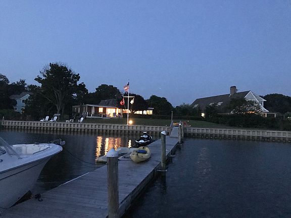Located in the beautiful waterfront community of Old Harbor Colony, this home features some of the best sunset views around. 5 bedrooms, 3.5 baths, heated gunite pool, and hot tub. Enjoy fishing off the new dock on this private newly bulk-headed property. Perfect retreat for the Hampton Classic. ONLY AVAILABLE FOR LAST 2 weeks of August and Labor Day Weekend