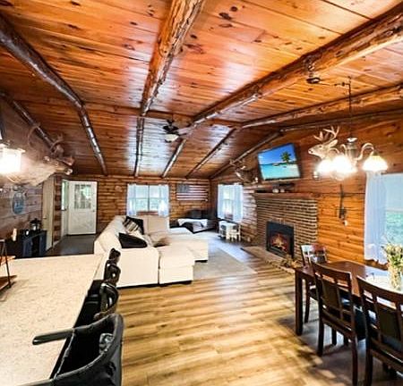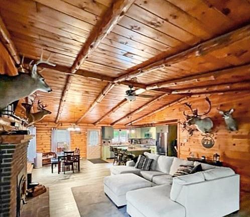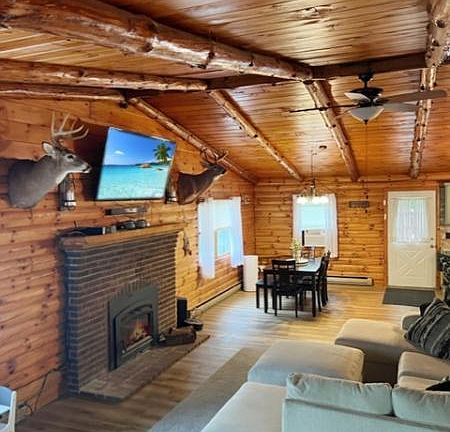 Country Living at its Best! Custom Log Home sits on 3 Private Tranquil Acres. Open floor plan - Living Room with cathedral ceiling opens to Updated Kitchen with custom cabinetry and dining area. Great for entertaining! Wood Stove in Living Room along with wood stove in family room in finished basement. 3 bedrooms, 2 full baths, hardwood floors with finished walk out basement. Whole house generator included. Deck off Dining area with electric awning. Leads to 30x15 inground pool. Newly paved driveway, New Roof.
