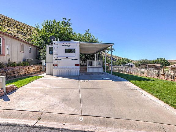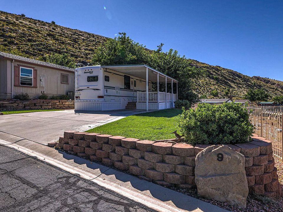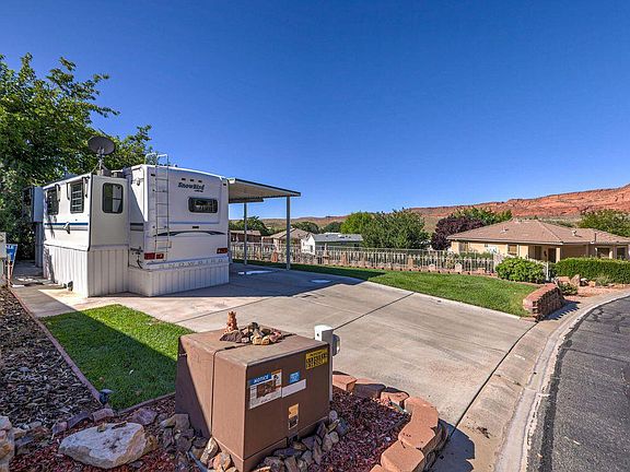 1995 NUWA Snowbird-5th wheel home, permanently mounted. 10X20 trex deck w/drop down sun shades (see thru.) Beautiful views of Red Cliffs, National Park & miles of hiking trails. Plumbing is all pex w/house fixtures, standard house toilet (no holding tank,) water bill paid thru HOA. Newer 10 gal. hot water heater (electric.) Coach power upgraded w/new 40 amp breaker Dedicated power cord)-12) installed recently from the outside power island into coach to power AC/heat pump & portable, (this frees up the coach power, Portable & removable Della heat pump used mainly for AC roof.) AC is not used-the coach has a propane forced air heater. Roof cleaned & resealed. washer/dryer combo, 8X8 workshop, Clubhouse w/ workout equipment, pool table, kitchen, pool, spa. Views!