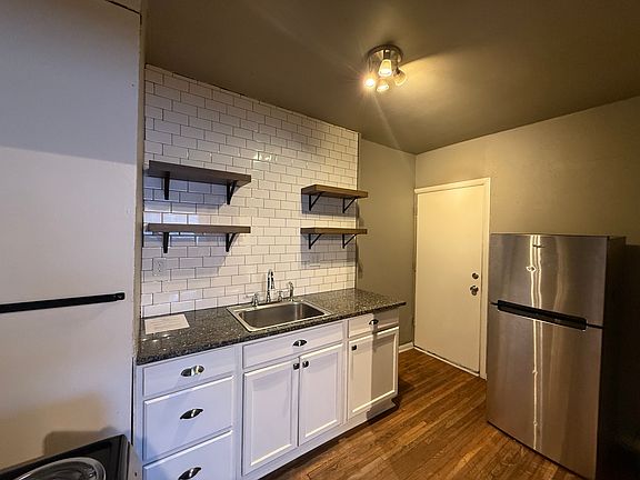 One bedroom studio units have a large living area with hardwood floors, bedroom alcove, kitchen with stainless appliances, granite counter tops & subway tile back splashes with open shelving.