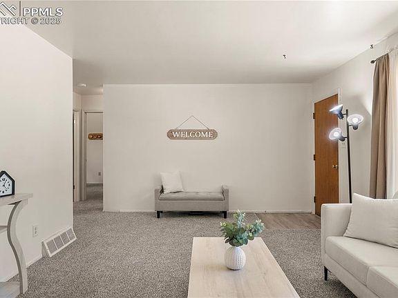 Former Widefield Homes model home on Large Corner Lot! This beautifully maintained home sits on a spacious corner lot and features numerous updates throughout. Fresh interior and exterior paint. Step inside to brand new carpet throughout and new luxury vinyl plank (LVP) flooring in the kitchen and dining room. Newer vinyl windows. Located in an established neighborhood close to schools, parks, and amenities. Walking distance to shopping and just 6 minutes from Fort Carson!