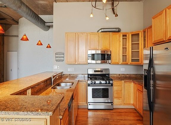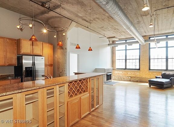 True concrete loft in the West Loop! 1,750 sq ft large open floor plan with upgraded kitchen, SS appliances, granite counters, hardwood floors, 12' ceilings, exposed brick & huge windows. Both bedrooms are fully enclosed with huge walk-in closets, plenty of storage & W/D in unit. Great southern exposure brings in tons of light. Impressive common roof top deck with unobstructed views of city! One heated garage space included!