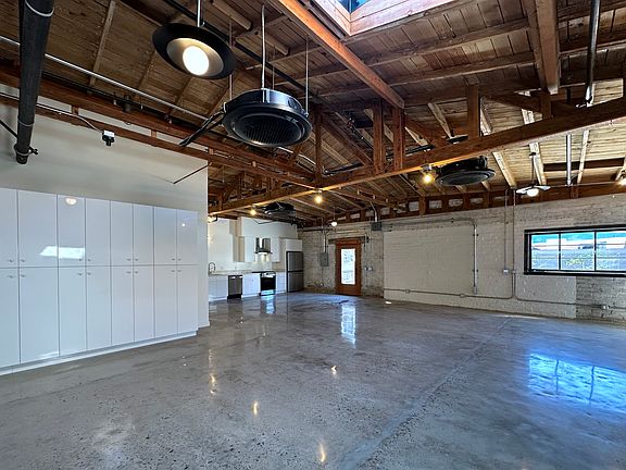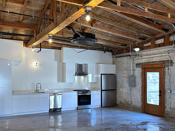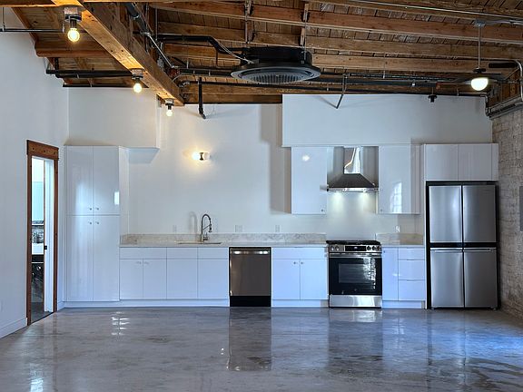 Completely remodeled spaceIndustrial-inspired unitSleek modern kitchenExpansive open-plan livingHigh beamed ceilingsQuartz countertopsStainless steel appliances