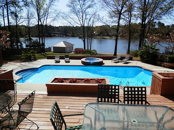 Stunning Waterfront home and setting with exceptional plan and design. This custom built home will take your breath away with its soaring 18' ceiling in main family room with gorgeous view.Large keeping room and breakfast area is inviting. Kitchen with island, pantry.Beautiful master suite with dream view, large bath and closet. 2nd Bedroom and bath down. Staircase leads to open walkway with breathtaking views off 1st floor and lake and pool. Upstairs boasts three bedrooms, two baths and a bonus room. Cabana/pool house in back overlooks gorgeous saltwater pool and skiing lake. Boathouse and sandy beach complete this picturesque setting